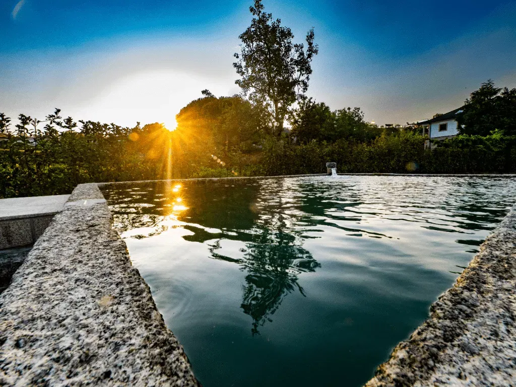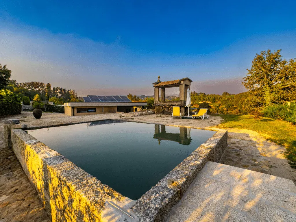 Em vez de piscinas artificiais padronizadas, procure a autenticidade minhota. Propriedades que preservam tanques de pedra com água corrente oferecem uma experiência única de frescura revigorante nos dias quentes — uma ligação direta às nascentes da montanha que revitaliza o corpo e a mente após uma caminhada.